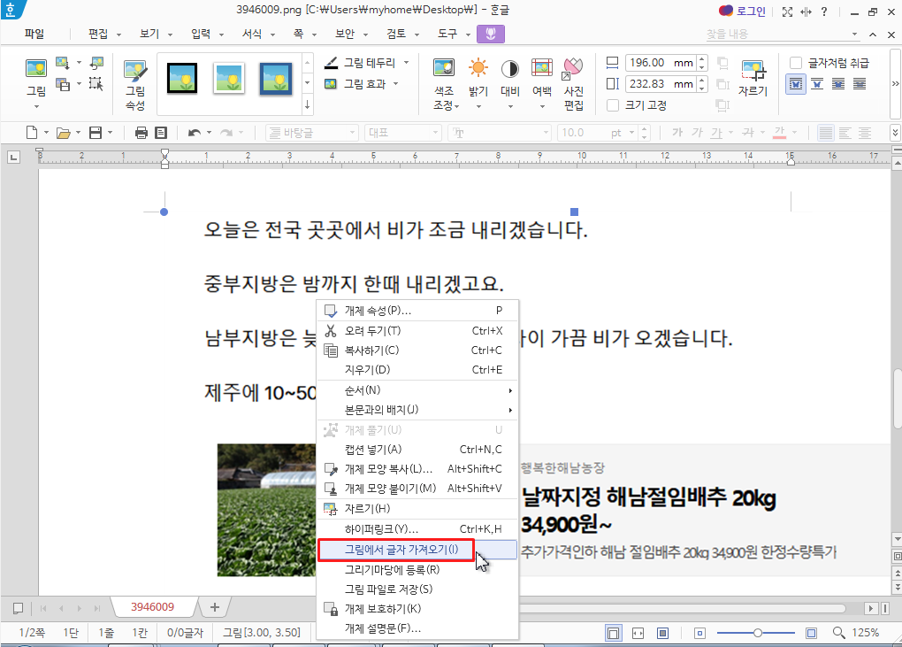 사진 위에서 마우스 우클릭하면 '그림에서 글자 가져오기' 메뉴가 있으니 그걸 선택하면