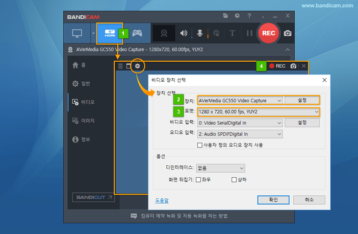 2).설정" 버튼을 클릭한 후, 녹화할 비디오 장치를 선택합니다.