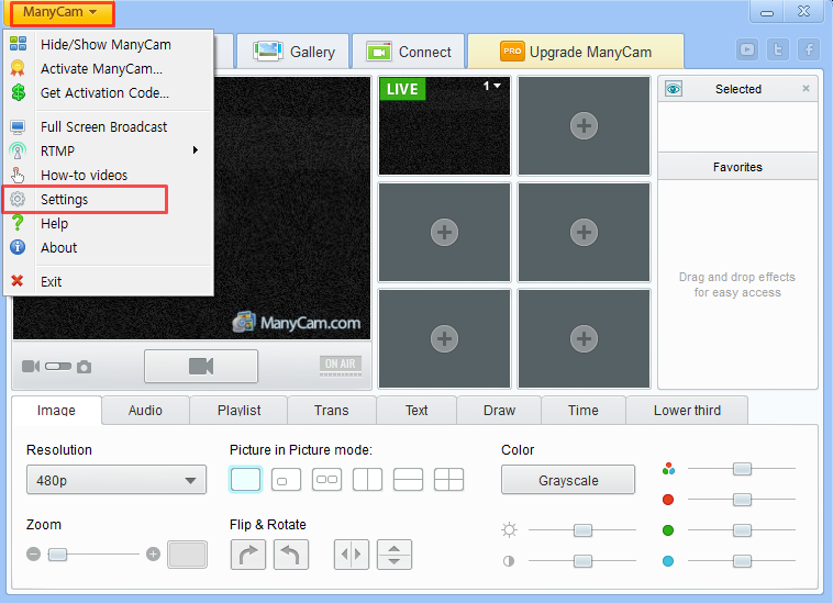 왼쪽 상단에 Manycam▼ 클릭하고 Settings 로 들어가 주세요.