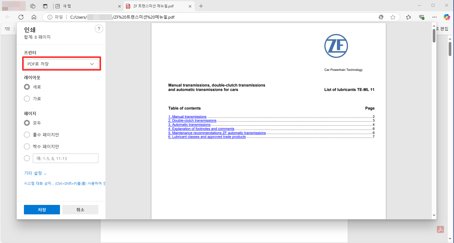 4. 프린터를 프린터기기 대신 [PDF로 저장] 또는 [Microsoft Print to PDF] 로 지정한다.