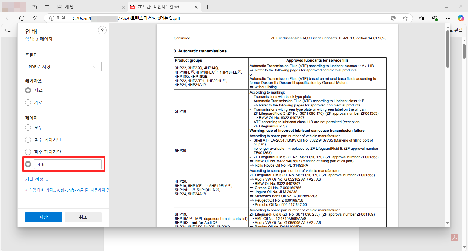 5. 페이지를 맞춤설정으로 지정하고, 원하는 페이지를 지정한다. (e.g. 4페이지~6페이지 추출을 원할 경우, "4-6"으로 입력)