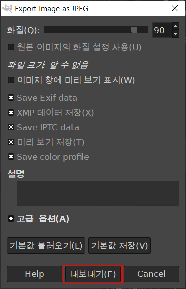 그럼 'Export Image as JPEG' 창이 뜨는데 내보내기 를 눌러주면 끝 입니다.