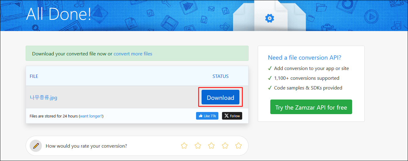 완료되면 Download 버튼을 나오는데 클릭해 다운받으시면 됩니다.