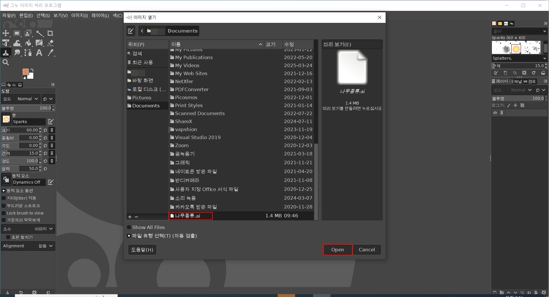 탐색기 창에서 ai 파일이 있는 폴더로 들어가 해당파일을 선택후 Open 을 눌러줍니다.