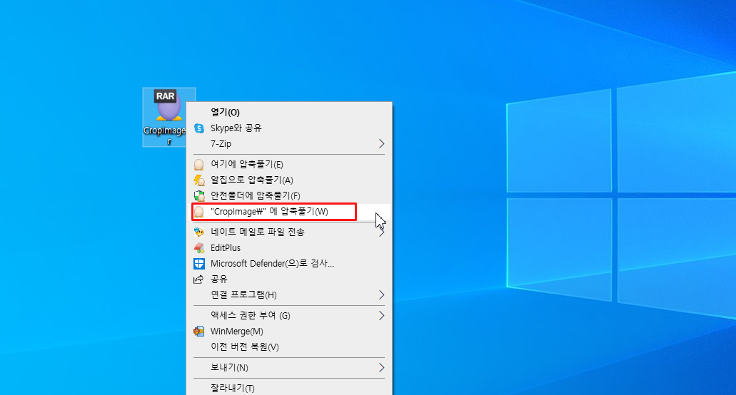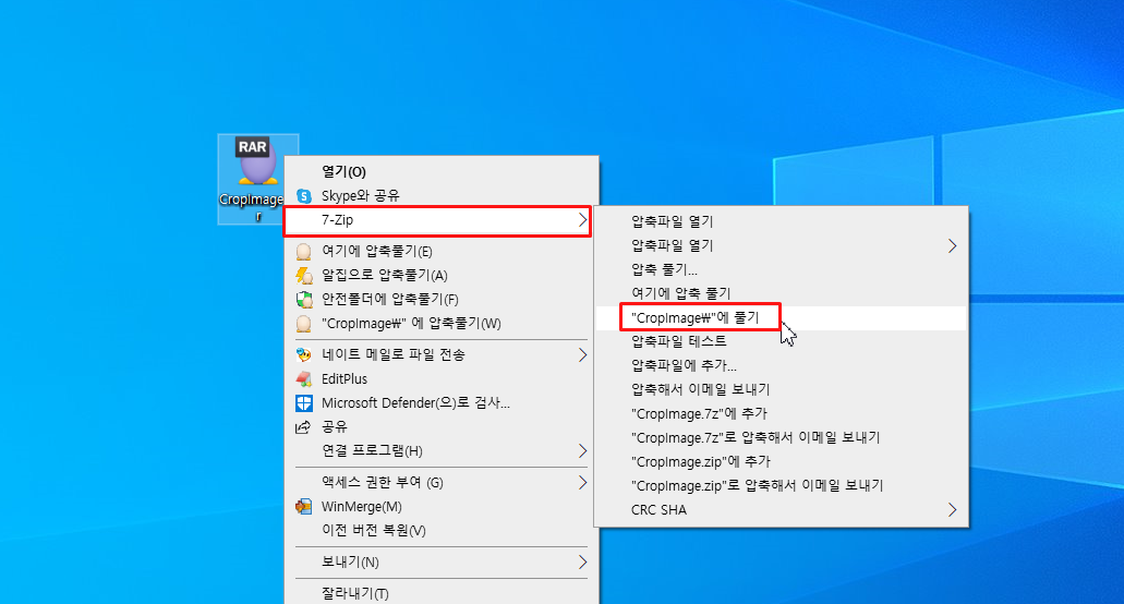 2. RAR 파일을 우클릭 > "7-Zip" > "[파일이름] 에 풀기" 또는 "여기에 압축 풀기" 선택.