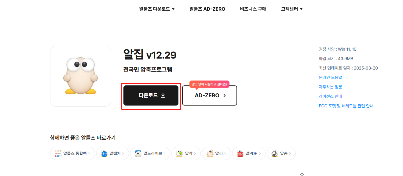 1. [알집 공식 웹사이트]( https://altools.co.kr/product/ALZIP )에서 프로그램 다운로드 및 설치.