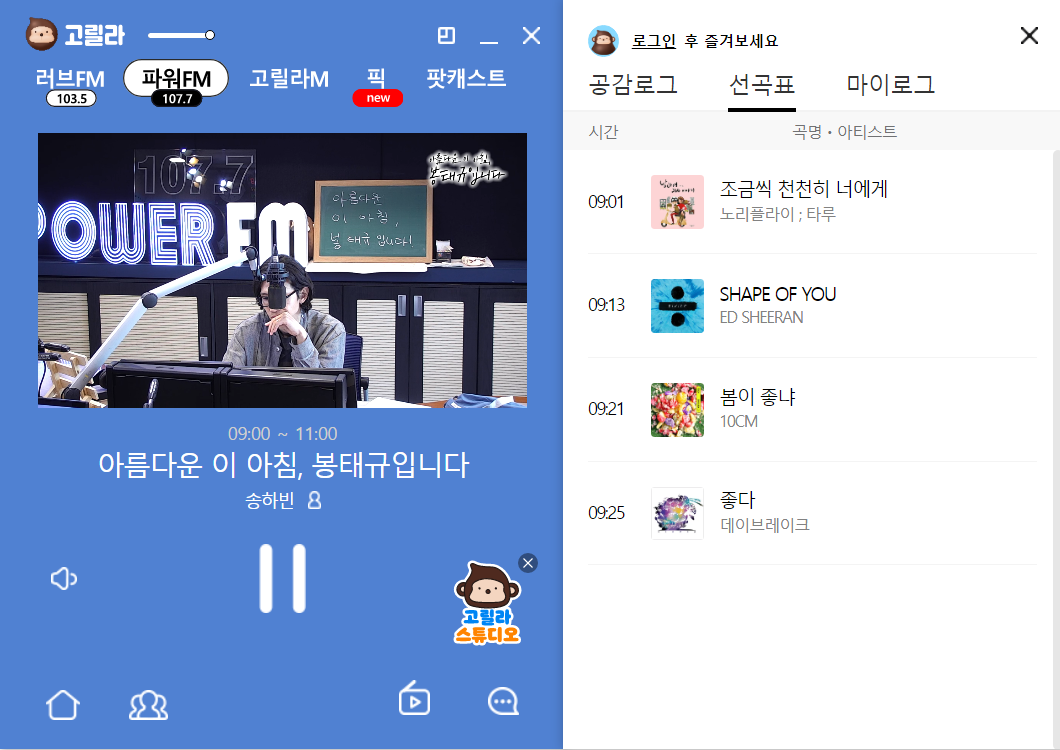 로그인 없이 파워FM, 러브FM 라디오 방송을 청취하실 수 있습니다.