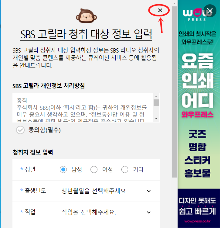 설치 완료되면 위와같이 "SBS 고릴라 청취 대상 정보 입력" 창이 뜨는데