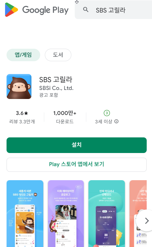 2. 검색 결과에서 SBS 고릴라 앱을 선택하고 설치 버튼을 눌러 다운로드합니다.