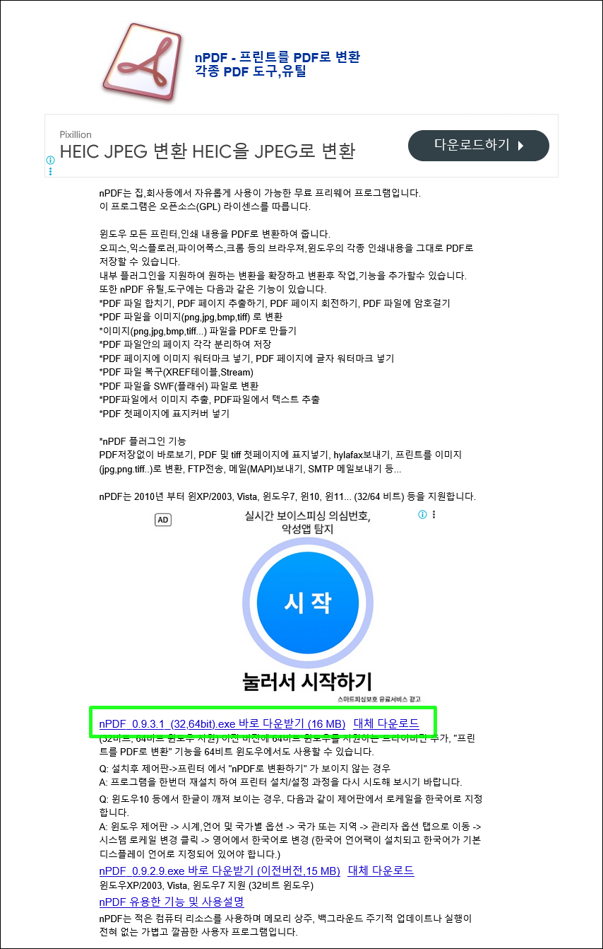사이트에 접속후 초록색으로 표시한 "nPDF_0.9.3.1_(32,64bit).exe 바로 다운받기 (16 MB) 대체 다운로드" 링크를 클릭해 다운받으시면 됩니다.