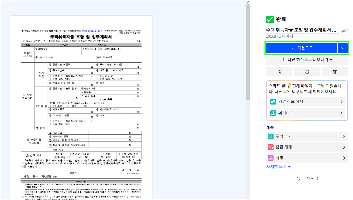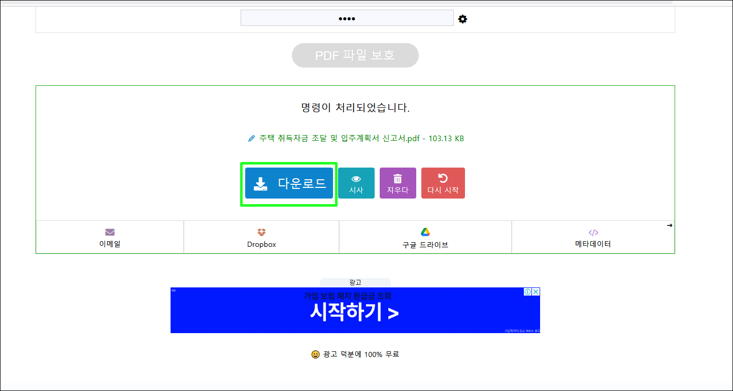5. 완료되면 다운로드 버튼을 눌러 암호화된 PDF 파일을 다운로드합니다.