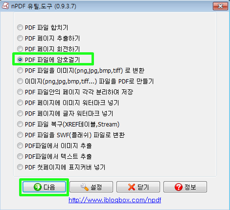 PDF 파일에 암호 걸기 를 선택하고 하단에 다음 버튼을 클릭합니다.