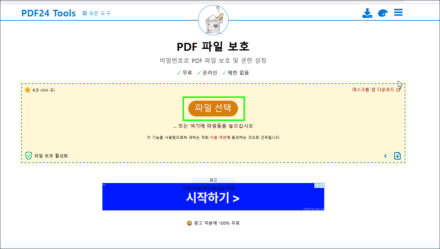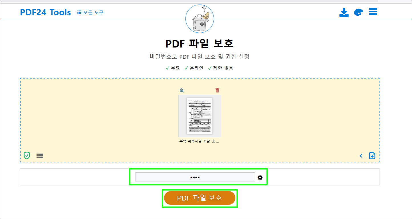1. [PDF 파일 보호 도구]( https://tools.pdf24.org/ko/lock-pdf )에 접속합니다.