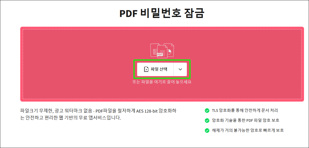 2. [파일 선택] 을 눌러 암호를 설정할 PDF 파일을 업로드하거나 드래그 앤 드롭합니다..