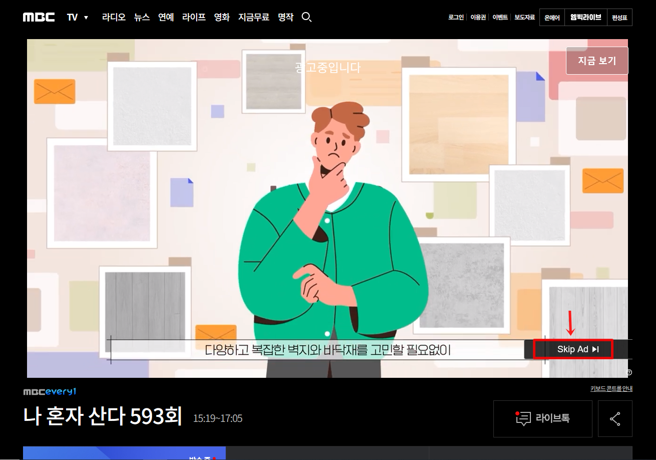 그럼 광고가 나오구요. 광고좀 보다가 SKIP 나면 클릭하면 건너뛰기 할 수 있습니다.
