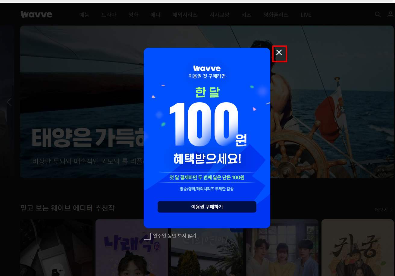 사이트에 접속하면 화면가운데 팝업창이 뜨는데 X 를 눌러 닫아줍니다.