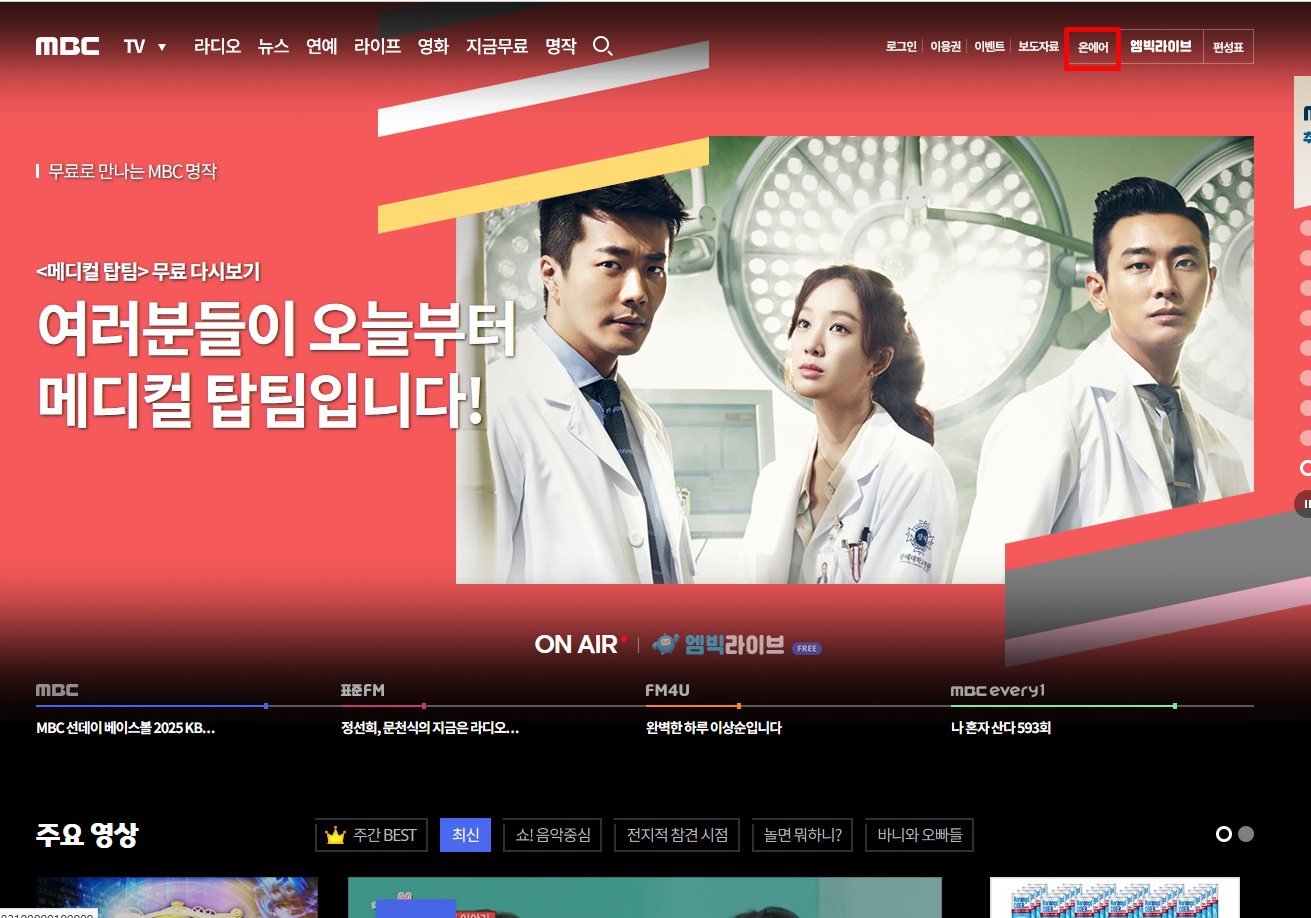 MBC 홈페이지에 접속후 우측상단에 "온에어" 를 클릭합니다.