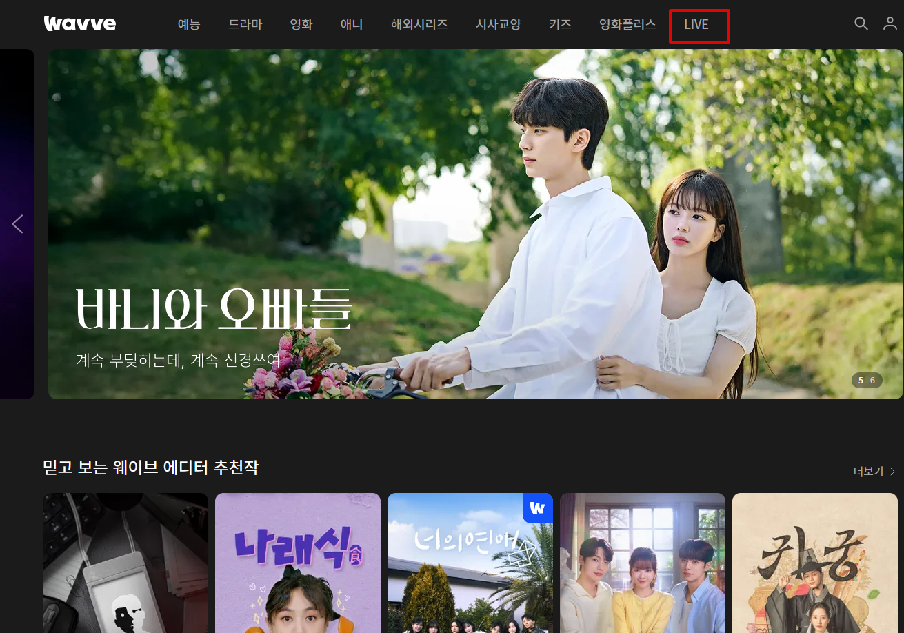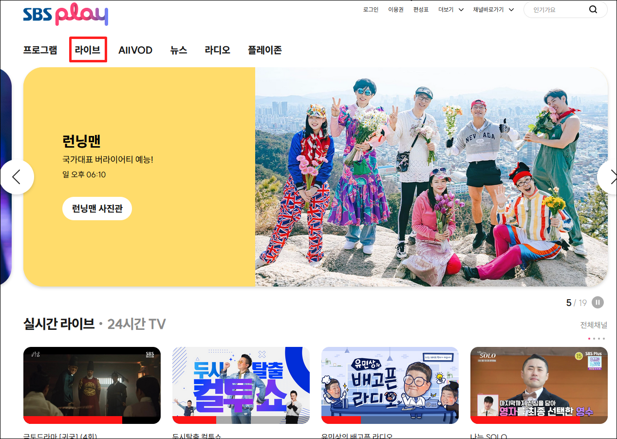 메인 페이지 상단에 위치한 메뉴에서 "라이브" 탭을 클릭합니다.