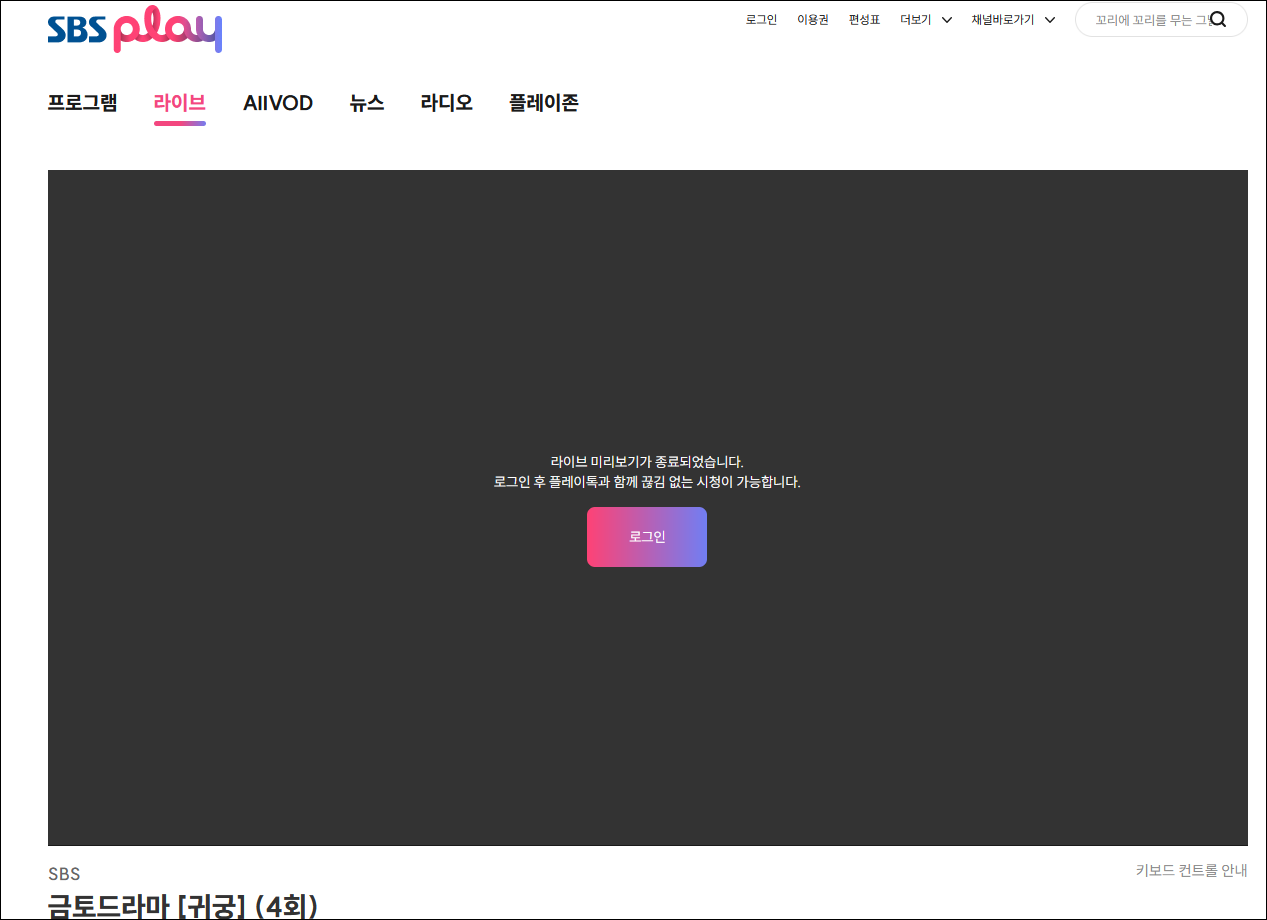 - 실시간 방송시청은 SBS 회원가입 및 로그인 절차가 필요합니다.