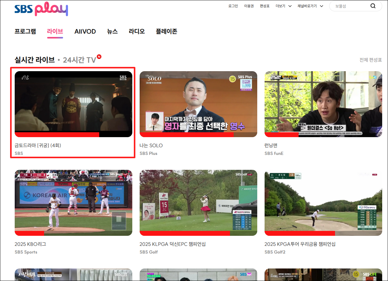 라이브 페이지가 열리면, 제공되는 채널 목록 중 첫 번째 보이는 "SBS" 를 클릭합니다.
