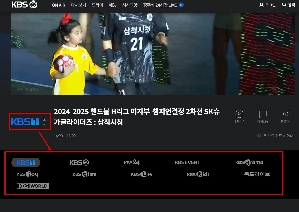 KBS 다른 채널로 변경하려면 KBS 로고를 클릭하여 채널 목록을 펼친 뒤 원하는 채널을 선택하면 됩니다.