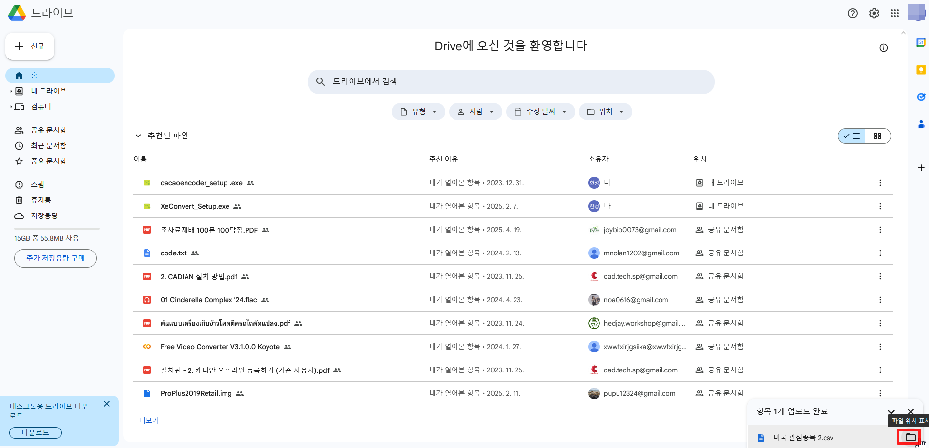 - 업로드 완료되면 우측 하단에 업로드 된 파일이 표시되는데 마우스를 올리고 폴더모양그림 "파일 위치 표시" 을 클릭해 열어줍니다.