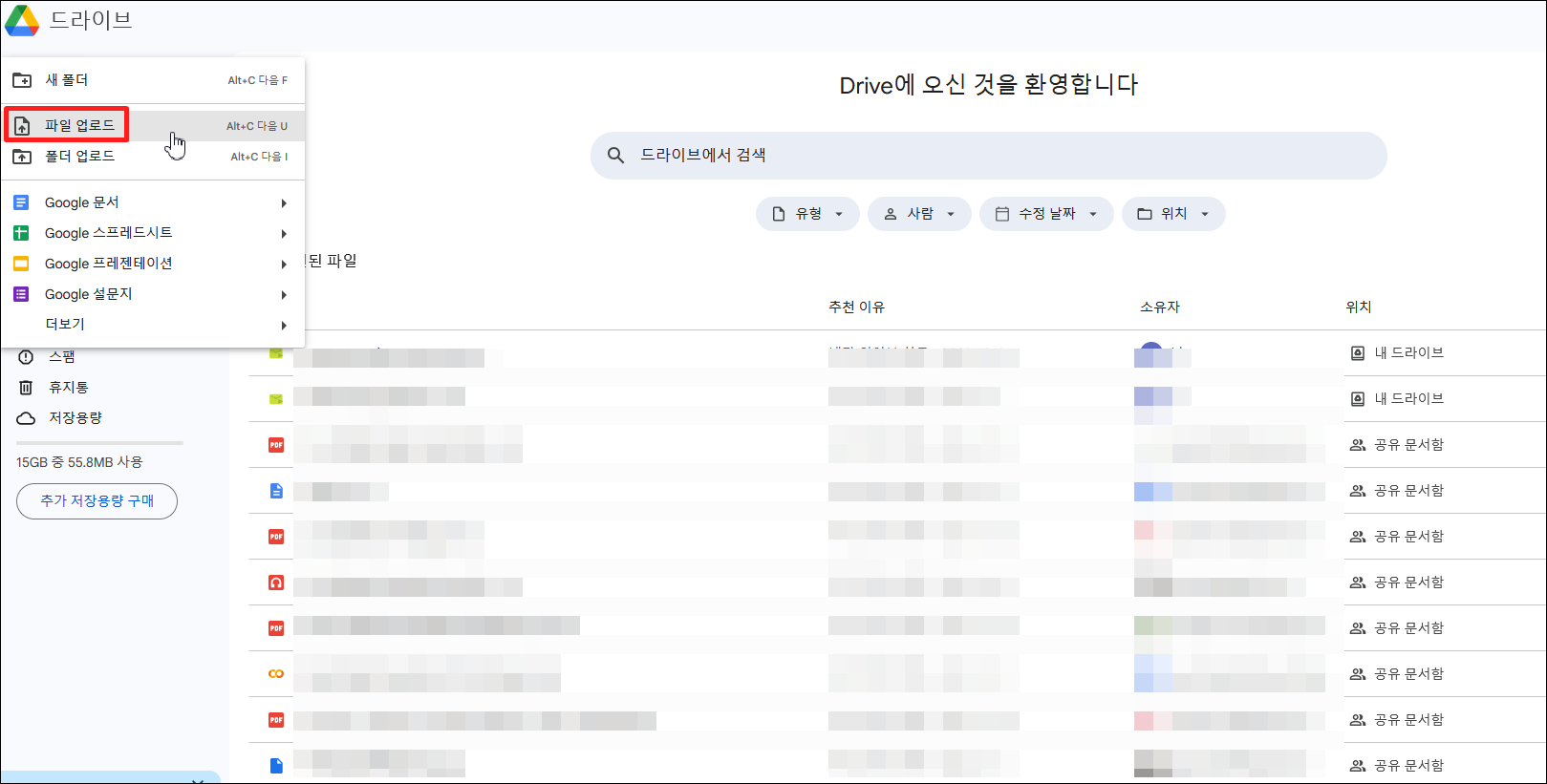 - [Google Drive]( https://drive.google.com )에 접속하여 로그인합니다.