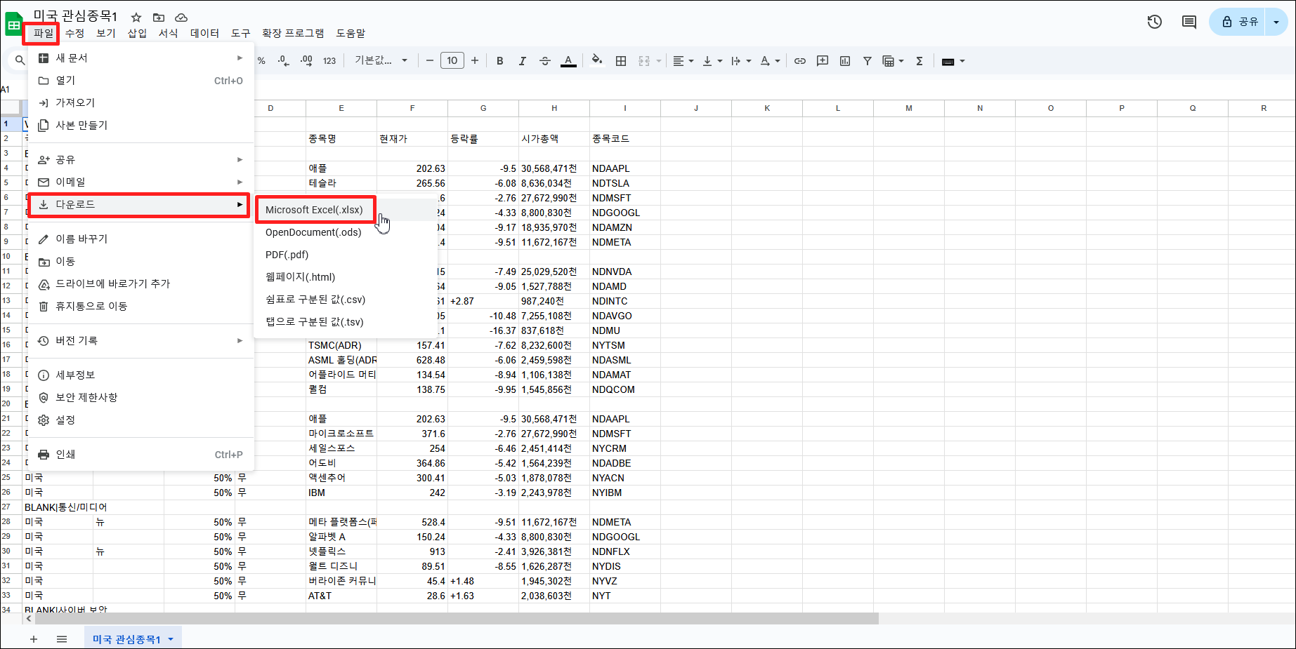 - 상단 메뉴에서 **파일 > 다운로드 > Microsoft Excel (*.xlsx)**를 선택하여 엑셀 파일로 저장합니다.