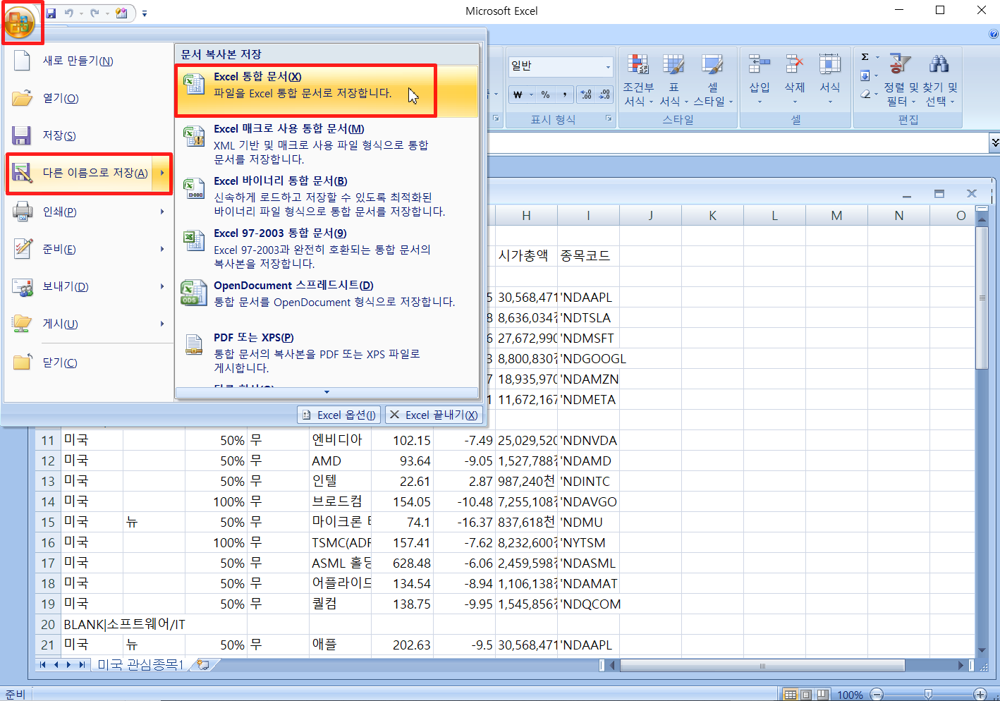 - 왼쪽 상단 동그란 메뉴 누르고 **다른 이름으로 저장 > Excel 통합 문서 (*.xlsx)**로 선택합니다.