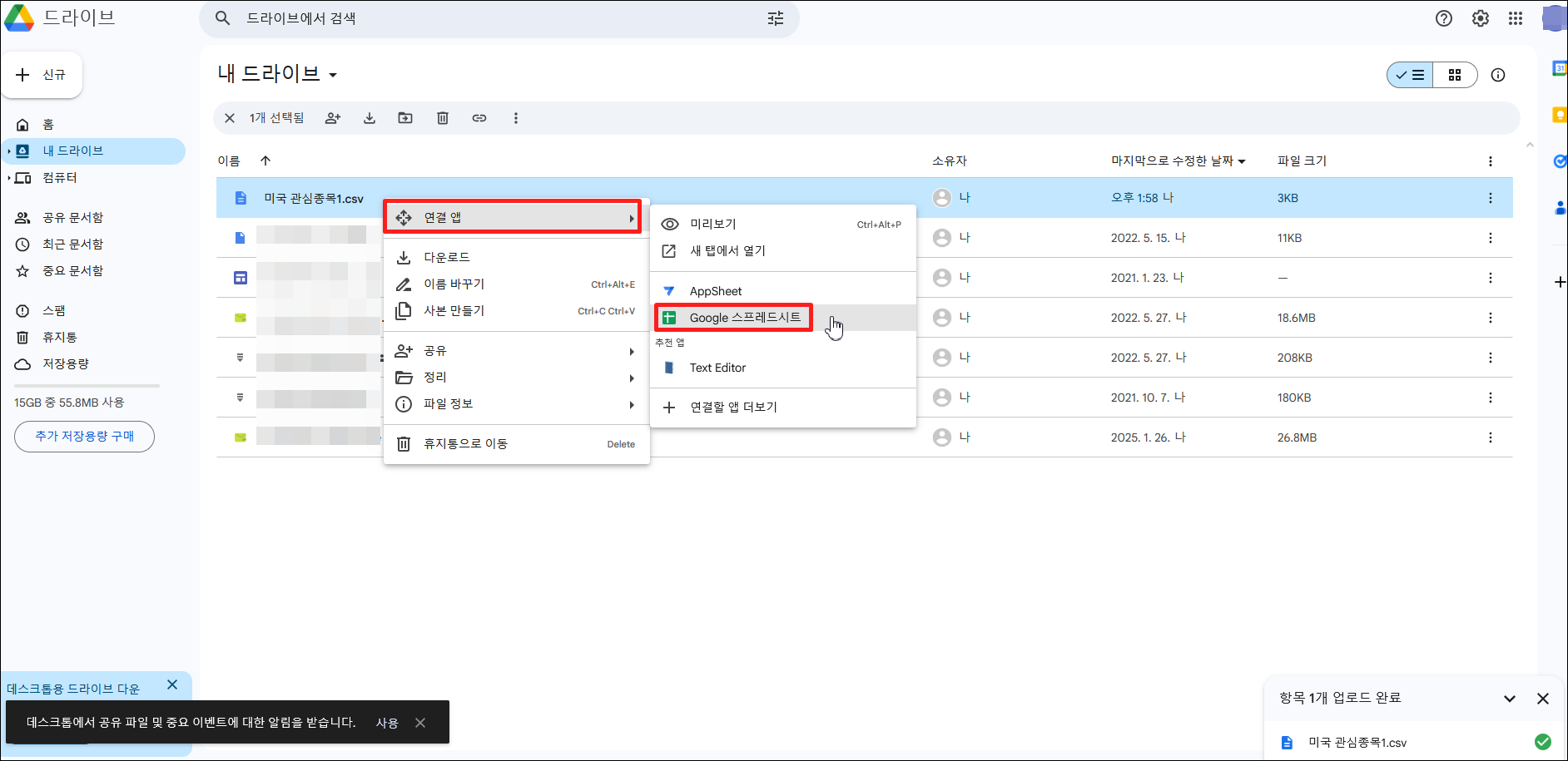 - 그리고 업로드된 CSV 파일을 오른쪽 클릭하여 **연결 앱 > Google 스프레드시트** 를 선택합니다.