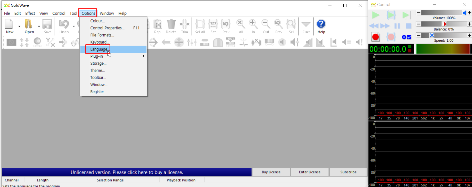 상단 메뉴에서 [Options] → [Language]를 선택합니다.