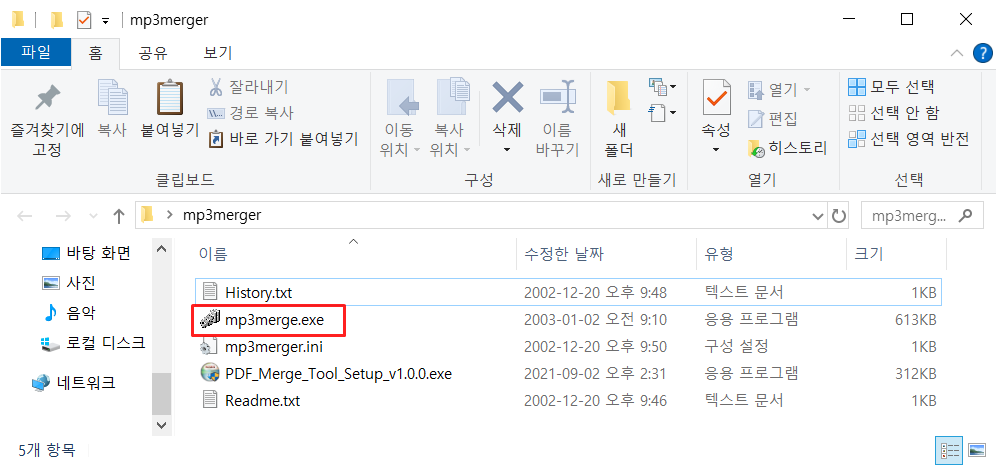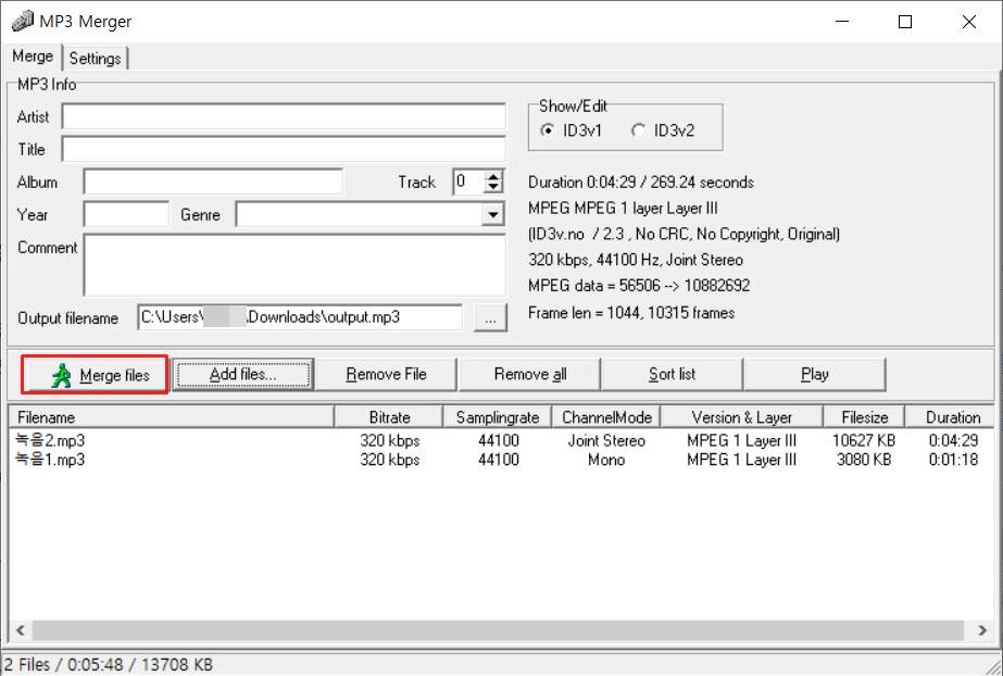 압축풀고 mp3merge.exe 를 실행 하면 됩니다.