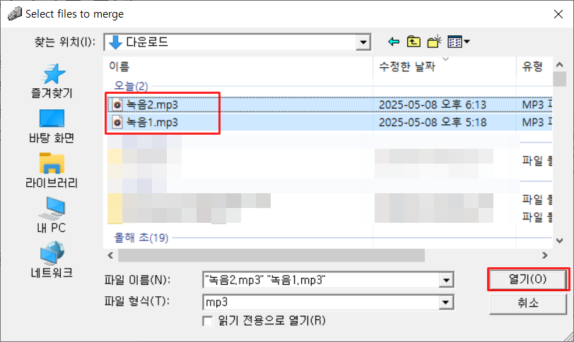 합치고자 하는 mp3파일을 찾아 열어줍니다.