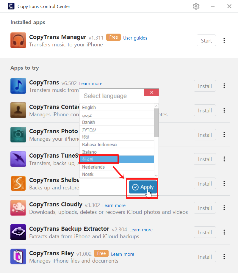 한국어를 선택후 Apply 버튼을 눌러 줍니다.