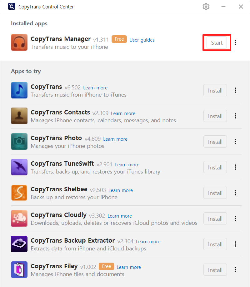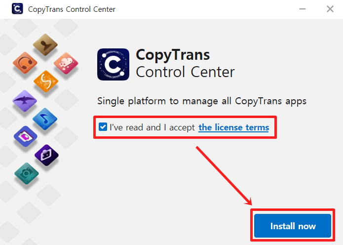 CopyTrans Control Center 창이 열리면