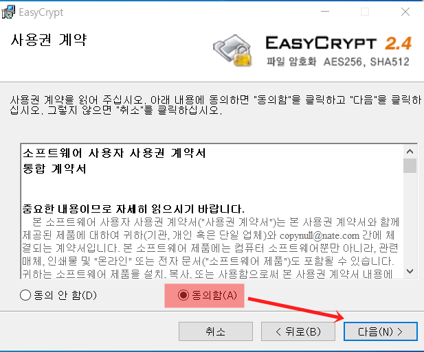 사용권 계약화면이 나오면 아래 동의함 선택 후 다음 버튼을 클릭합니다.