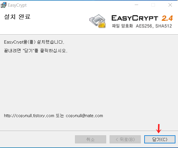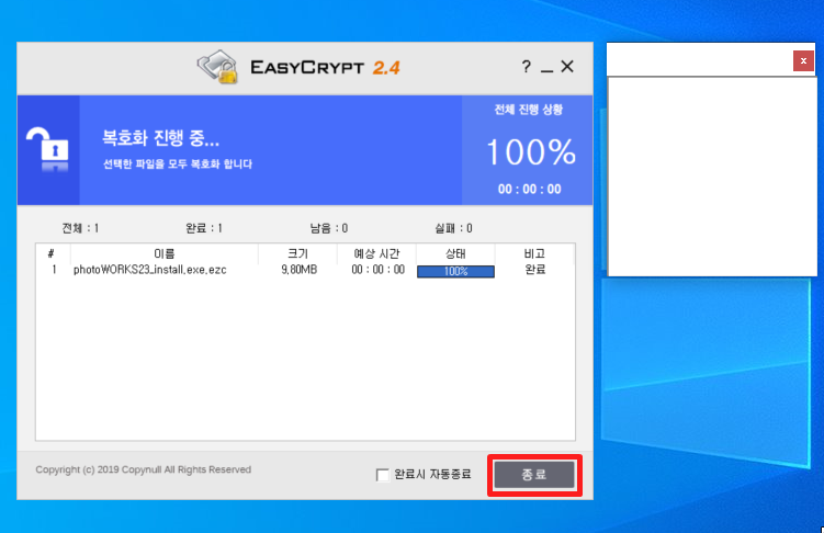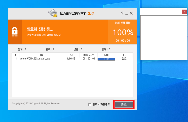 파일 암호화 완료되면 종료를 눌러 창을 닫아줍니다.