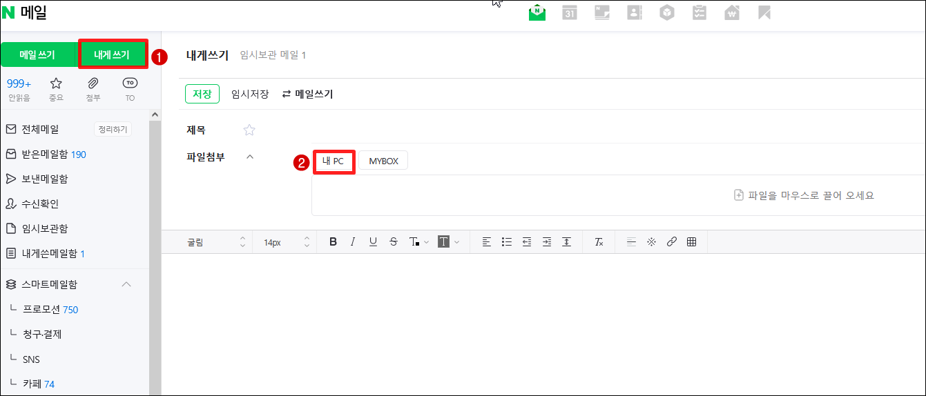 네이버 메일 로그인 후 메일 페이지에서 내게쓰기를 눌러줍니다.