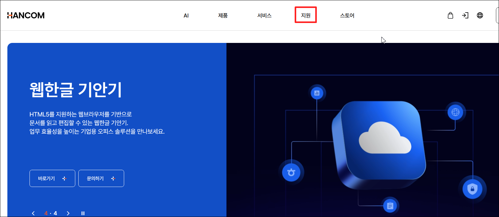 한글과컴퓨터 공식홈페이지에 접속후 상단단 지원 메뉴에 마우스를 올려좁니다.