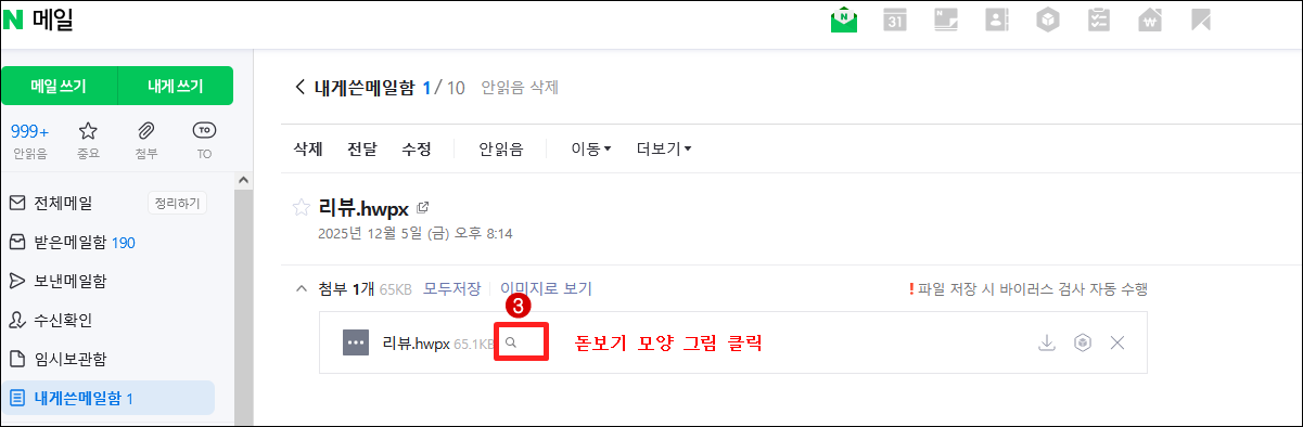 내게쓴메일함 에서 좀 전에 보낸 메일을 열어줍니다.