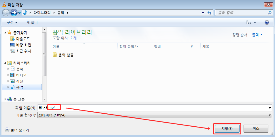 파일저장 창이 뜨면 파일이름뒤에 mp3 확장자를 mp4 변경후 저장위치를 지정하고 저장버튼을 눌러줍니다.
