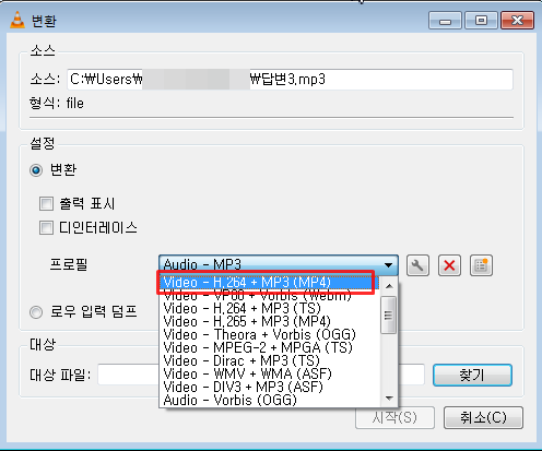 그리고 목록에에서 첫번째 "Video - H264 + MP3)(MP4)" 를 선택해줍니다.