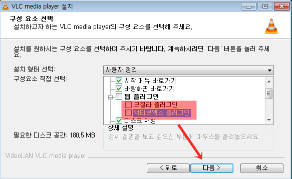 위와같이 "웹 플러그인" 체크 해제후 다음 버튼을 눌러준다.