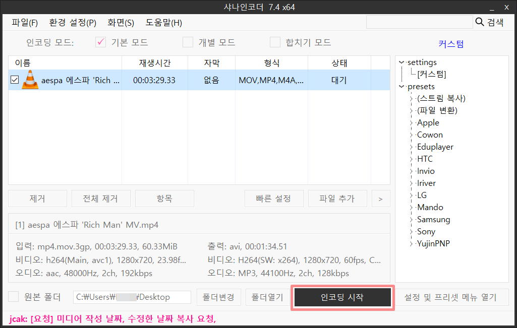 모든 설정이 완료되면 아래쪽의 [인코딩 시작] 버튼을 클릭합니다.