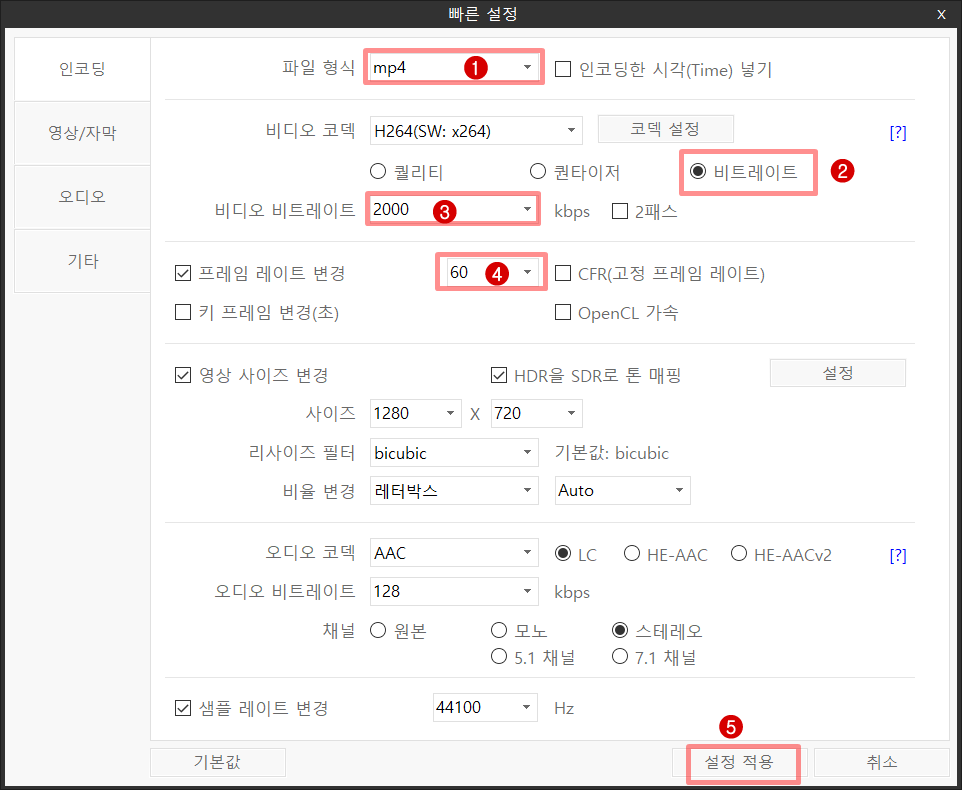 ### ④ 인코딩 설정(출력 형식/코덱 선택)