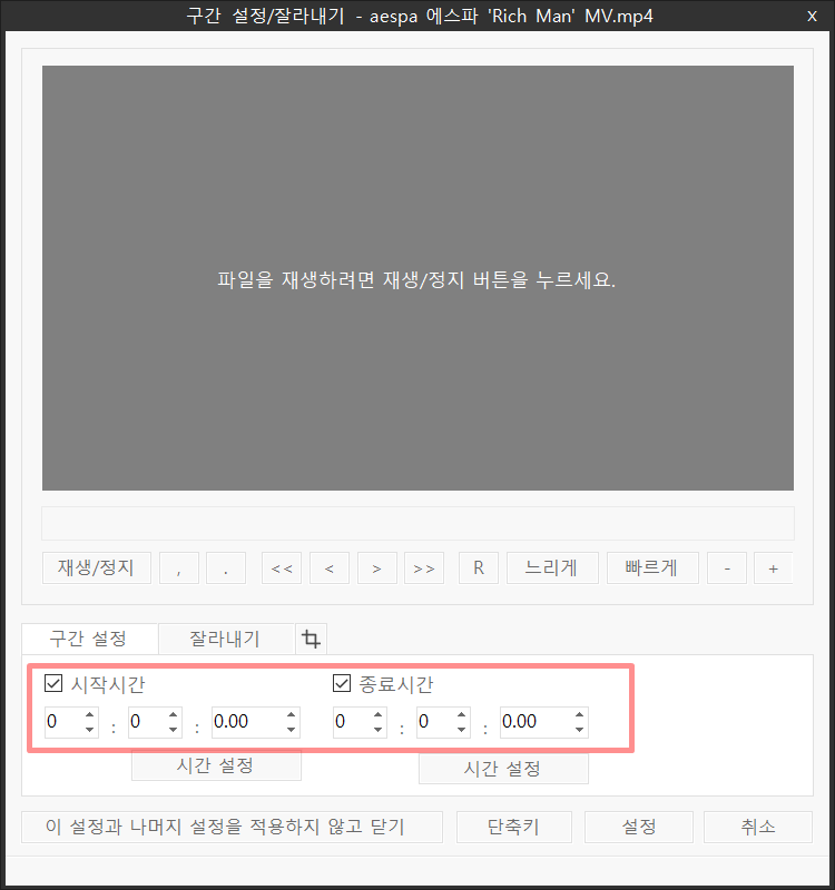 * 구간 선택 창에서 재생 버튼을 누른 후 원하는 위치에서 [시간 설정], [시간 설정] 버튼을 누르면 자동으로 시간에 반영됩니다.