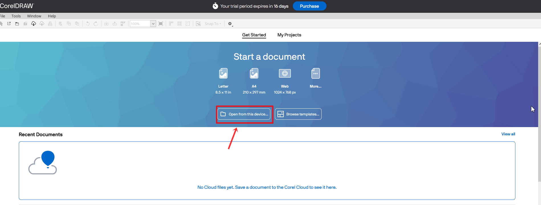 "open from this device" 를 눌러 변환하고자 하는 cdr 파일을 불러옵니다.