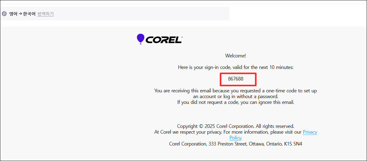 그럼 메일로 인증번호가 전송이 되는데, 메일을 확인해 본문에 숫자 코드 를 복사해줍니다.