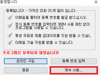 프로그램을 실행하면 먼저 ‘환영합니다’ 창이 나타납니다. 이 경우 체험판에서도 부팅 USB 제작 기능을 사용할 수 있으므로 [계속 사용] 버튼을 눌러 진행하시면 됩니다.