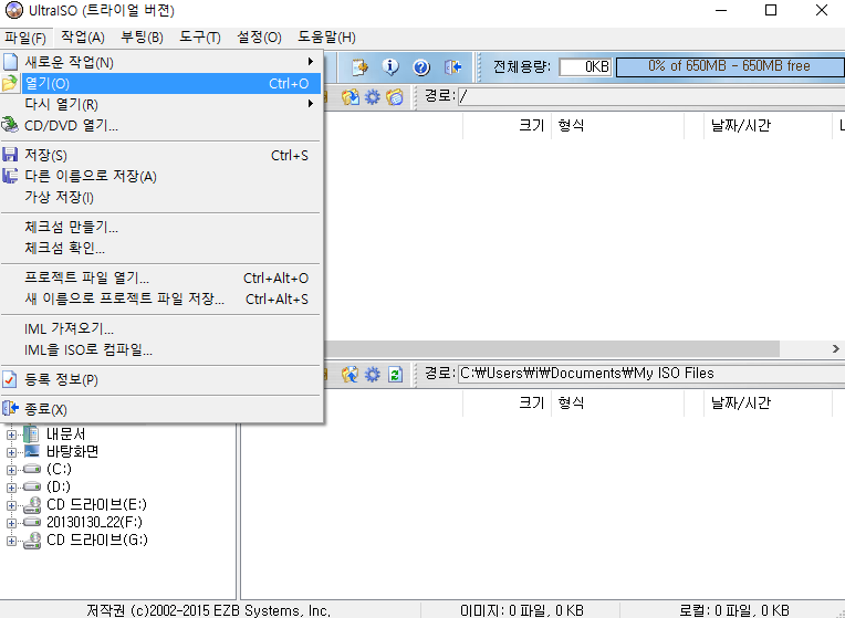 설치가 끝난 후 UltraISO 프로그램을 실행하면 메인 화면이 나타납니다.
